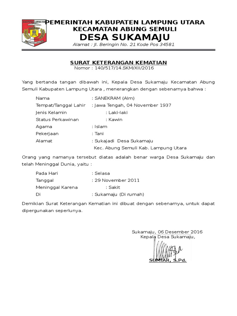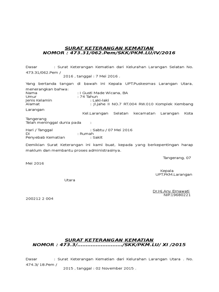 04 01 16 surat keterangan penyebab kematiandeskripsi lengkap. Atas perhatian dan kerjasamanya kami ucapkan terima kasih. Jenis surat keterangan kematian ini merupakan jenis surat dengan kode: Cara membuat surat keterangan kematian yang baik dan benar. Hanya dengan mengubah beberapa keterangan, anda akan mendapatkan surat kerja yang baik dengan format sesuai.